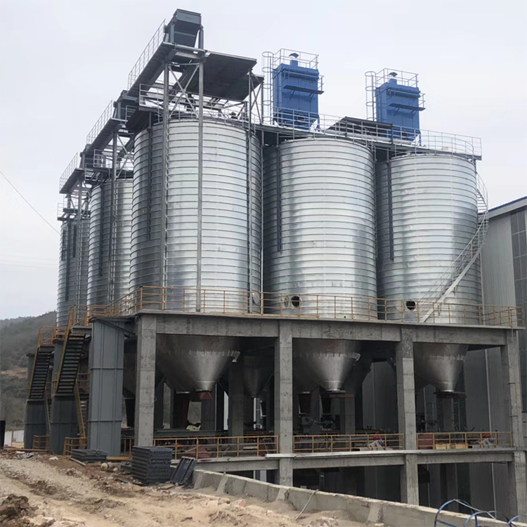 接收與清理設置在筒倉中央該形式筒倉一般采用對稱排列,提升機井架固定,經過提升后的物料通過倉頂溜管進人筒倉。這種形式省去了倉頂輸送設備和上通廊,從而節省了建造費用,縮短了建造工期。對于貯存時間要求較長的大型糧庫,則應根據物料的流向、場地情況、工藝要求等合理地配置投料口、工作塔、烘干塔及鋼板倉的位置。國華鋼板倉介紹了這幾種常見的進料形式,實際中可將各種形式相互組合,相互滲透,根據實際情況合理搭配,靈活選用。